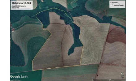 Matrícula nº 13.324 do 2° CRI de Toledo - PR: OS DIREITOS do Imóvel: Lote Rural n° 06-A, da Gleba n° 01, 1° Parte da Colônia São Francisco, com a área de 231,8658ha (duzentos e trinta e um vírgula oito mil seiscentos e cinquenta e oito hectares), oriundo do desmembramento de Uma Área de um Reflorestamento, esta desmembrada da Fazenda Acarahy, abrangendo parte dos Lotes Rurais n°s 6, 7 e 8, situado neste Município e Comarca de Toledo-PR. Cadastro no INCRA sob nº 721.190.093.572-9; Denominação do Imóvel: Lote 6ª, Colônia São Francisco; Área total (ha): 231,8658; Classificação Fundiária: Média Propriedade Produtiva; Localização do Imóvel: Colônia São Francisco; Município Sede: Toledo-PR; Módulo Rural (ha): 15,9467; N° Módulos Rurais: 14,54; Módulo Fiscal (há): 18,0000; N° Módulos Fiscais: 12,8814; FMP (há): 2,0; Área registrada (ha): 231,8658 conforme AV.04 da referida matrícula. IDENTIFICAÇÃO: Lote Rural nº 06-A, da Gleba nº 01, 1º Perímetro da Colônia São Fran cisco, com a área de 2.318.658,00m², ou seja, igual a 95,812315 alqueires paulista, sem benfeitorias, situado neste município, sendo que aproximadamente 85,0 alqueires paulista e de área mecanizada e o restante aproximadamente 10,812315 alqueires paulista é de área de mata e reserva, sendo que o terreno apresenta leve declive. AVALIAÇÃO ATUALIZADA: R$ 52.173.801,77 (cinquenta e dois milhões, cento e setenta e três mil, oitocentos e um reais e setenta e sete centavos), atualizada pela tabela do Tribunal de Justiça de São Paulo até (julho de 2025). ONUS: Consta da referida certidão de ônus extraída pelo site ARISP, em 12.08.2025, conforme AV.03 de 16.09.2009 - RESERVA LEGAL. Conforme Termo de Compromisso de Proteção de Reserva Legal SISLEG n° 1.094.813-2, firmado nesta Cidade, em 27.01.2009, a proprietária, Madeireira Talini LTDA, representada por seu sócio-gerente Imildo Talini, por sim seus herdeiros e sucessores, grava restrição de Reserva Legal, sobre uma área de 46,3732 hectares, correspondente a 20,00% da área total do imóvel desta Matrícula e se compromete no mesmo Termo a restaurar 24,9522 hectares de Reserva Legal conforme cronograma constante do Termo; conforme AV.07 de 14.06.2018 - AVERBAÇÃO PREMONITÓRIA - Fica averbado o ajuizamento da Execução de Título Extrajudicial objeto do processo n° 0002073-69.2018.8.16.0170, favor AMELIA TOMIE AIBARA; conforme AV.17 de 18.10.2023 - PENHOR/IMÓVEL DE LOCALIZAÇÃO, em favor de C. Vale - Cooperativa Agroindustrial Ltda - Rua Mate Laranjeira, 1416, Bairro Pinheirinho, Cep. 85.907-298, Toledo-PR, está localizado no imóvel desta Matrícula, sobre uma área de 72,60ha, o Penhor da lavoura de Soja, safra 2023/2024, conforme Registro Auxiliar n° 9.230; conforme R.18 de 11.12.2023 - PENHORA EXEQUENDA; conforme AV.19 de 05.01.2024 - PENHOR/IMÓVEL DE LOCALIZAÇÃO. Está localizado no imóvel desta Matrícula, sobre uma área de 72,60ha, o Penhor da lavoura de Milho, safra 2024/2024, conforme Registro Auxiliar n° 9.268; conforme AV.20 de 26.07.2024 - PENHOR/IMÓVEL DE LOCALIZAÇÃO. Está localizado no imóvel desta Matrícula, sobre uma área de 72,60ha, o Penhor da lavoura de Soja, safra 2024/2025, conforme Registro Auxiliar n° 9.365; conforme AV.21 de 09.01.2025 - PENHOR/IMÓVEL DE LOCALIZAÇÃO. Está localizado no imóvel desta Matrícula, sobre uma área de 72,60ha, o Penhor da lavoura de Milho, safra 2025/2025, conforme Registro Auxiliar n° 9.471; e conforme AV.23 de 12.06.2025 - PENHOR/IMÓVEL DE LOCALIZAÇÃO. Está localizado no imóvel desta Matrícula, sobre uma área de 170,00ha, o Penhor da lavoura de Soja, safra 2025/2026, conforme Registro Auxiliar n° 9.548. DÉBITO PROCESSUAL: R$ 16.940.309,60, conforme fls. 2158/2164 (julho de 2025)